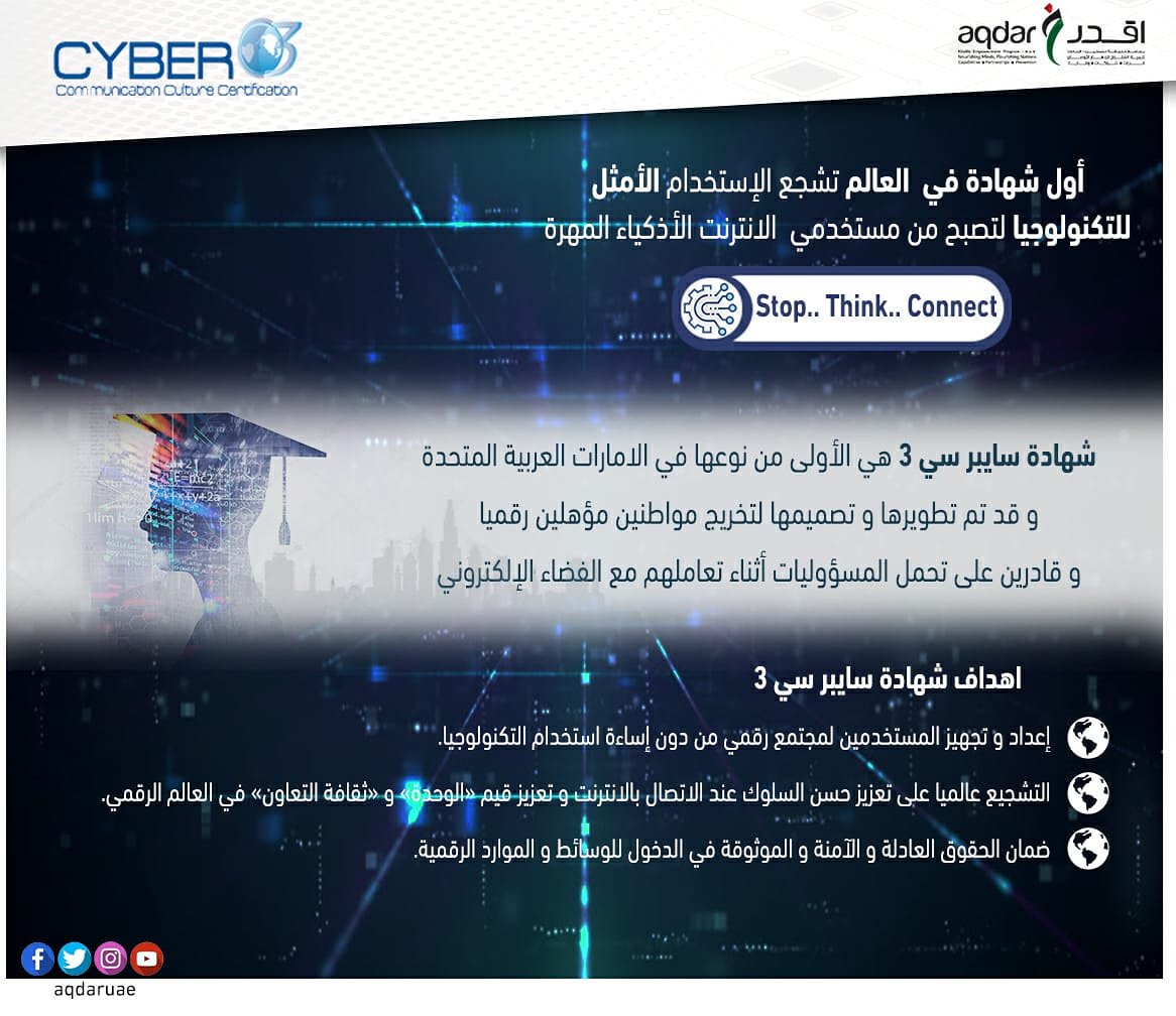 Aqdar اقــدر On Twitter برنامج خليفة للتمكين أقدر يطلق منصة المواطنة الرقمية Cyber C3 الأولى من نوع ها في العالم التي تم تطويرها وتصميمها خصيص ا لدولة الإمارات لتأهيل المشاركين حول المعرفة والمسؤولية