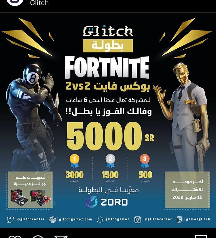 Sulaiman Alarifi سليمان العريفي On Twitter صالة Glitchcenter يعلنون على بطولة فورتنايت بمجموع جوائز 5 000 سعودي من نوع بوكس فايت ٢ ضد ٢ وراح يكون فيه سحوبات على كروت شاشة